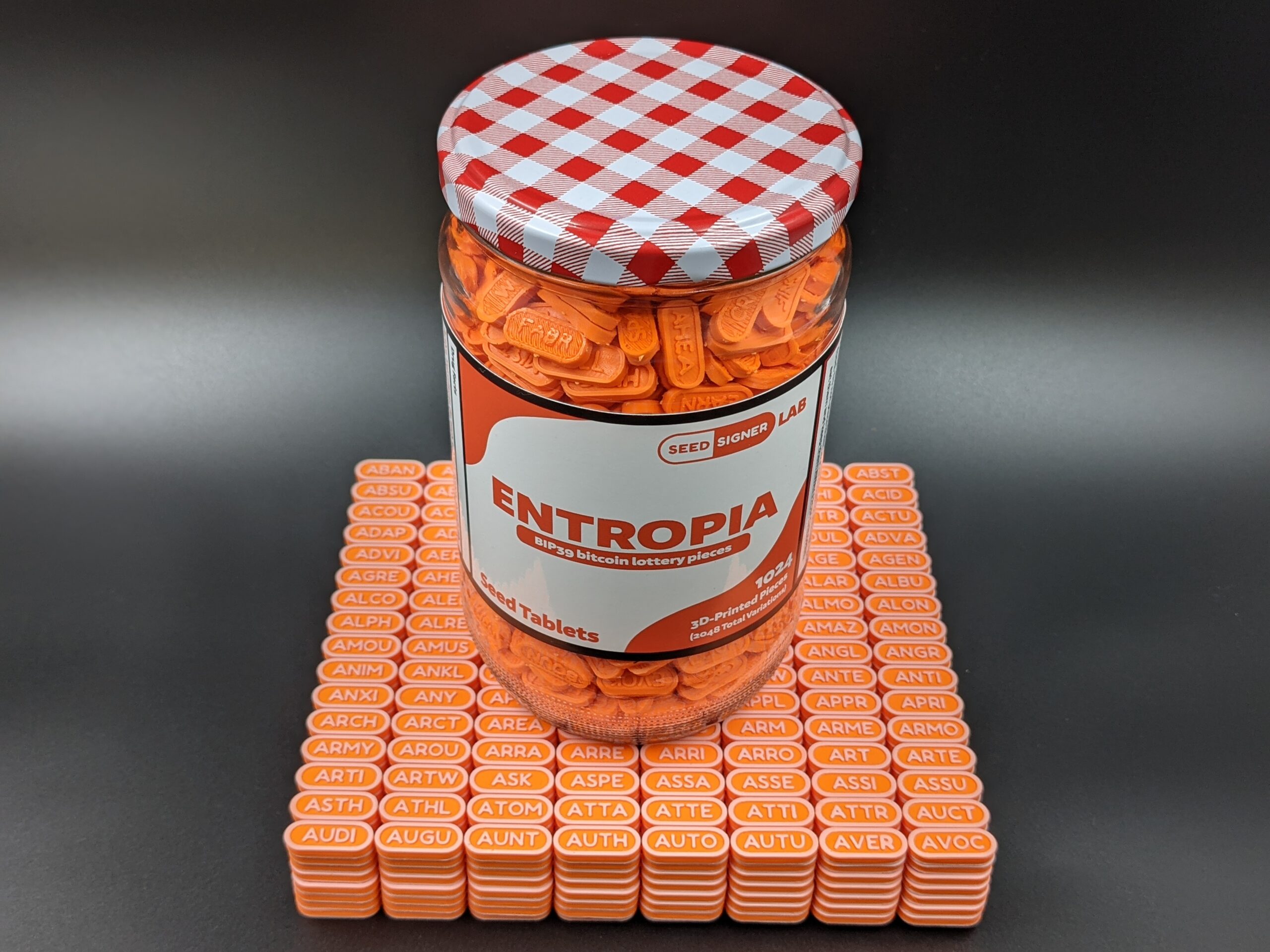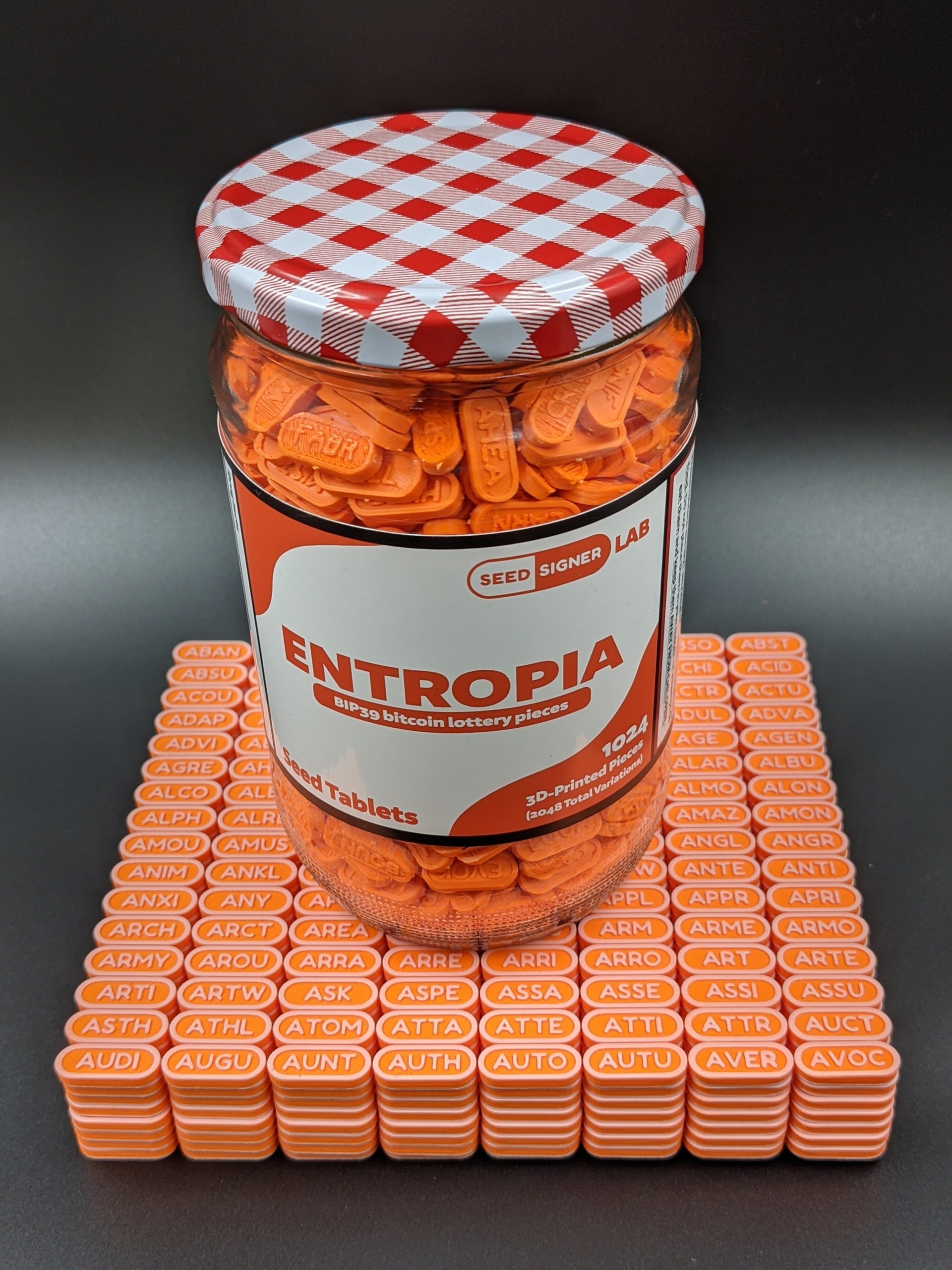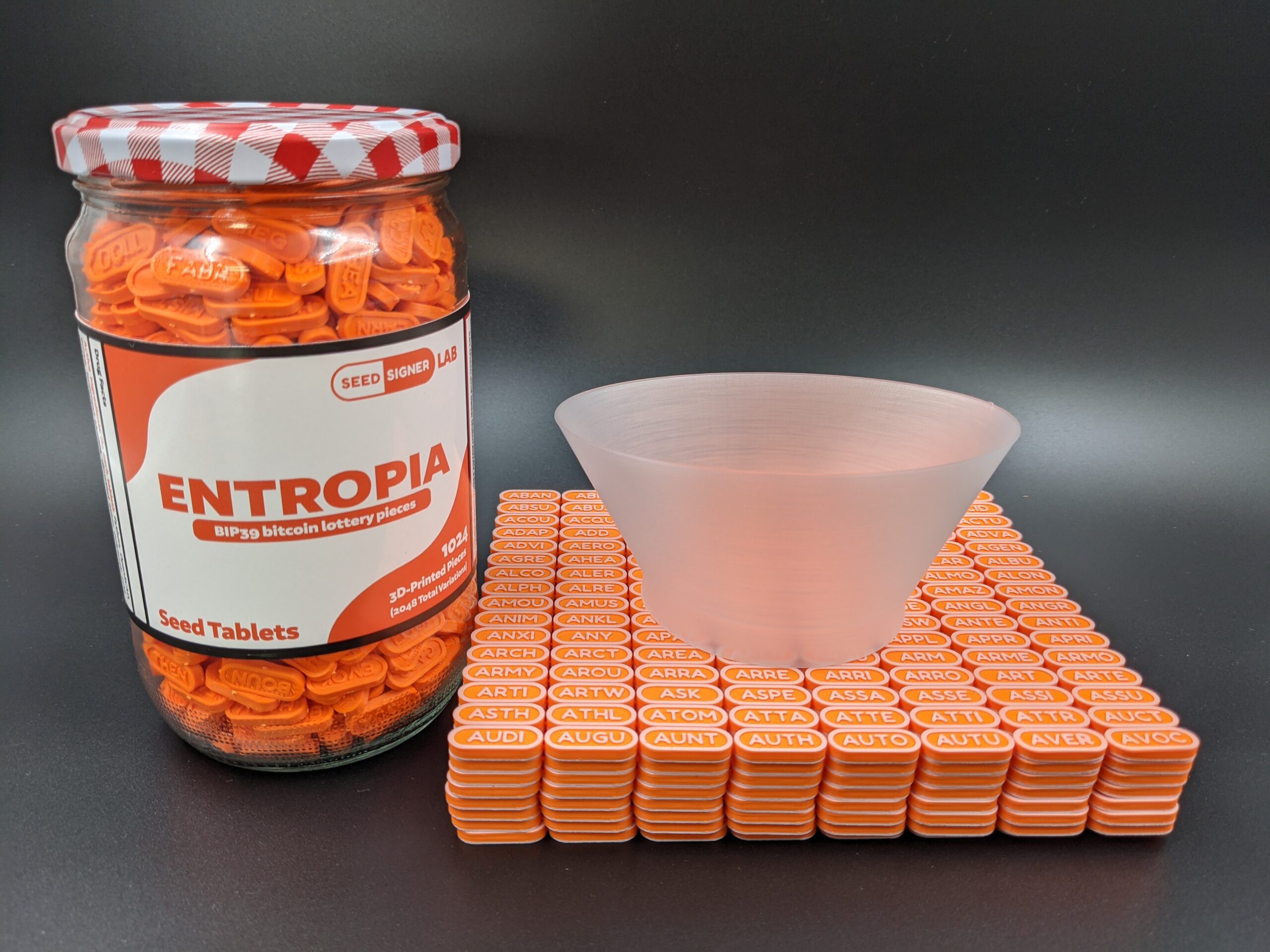 The set includes the pictured display jar with label, eight 8×16 sheets of seed tablets (for a total of 1,024 pieces), and a custom funnel. Two unique strings of 3-4 letters are placed on each tablet (one on either side) to create a total of 2,048 variations that represent the 2,048 unique words in the official bitcoin BIP39 word list. The sheets of tablets are alphabetized and can be verified against the official BIP39 word list available at: