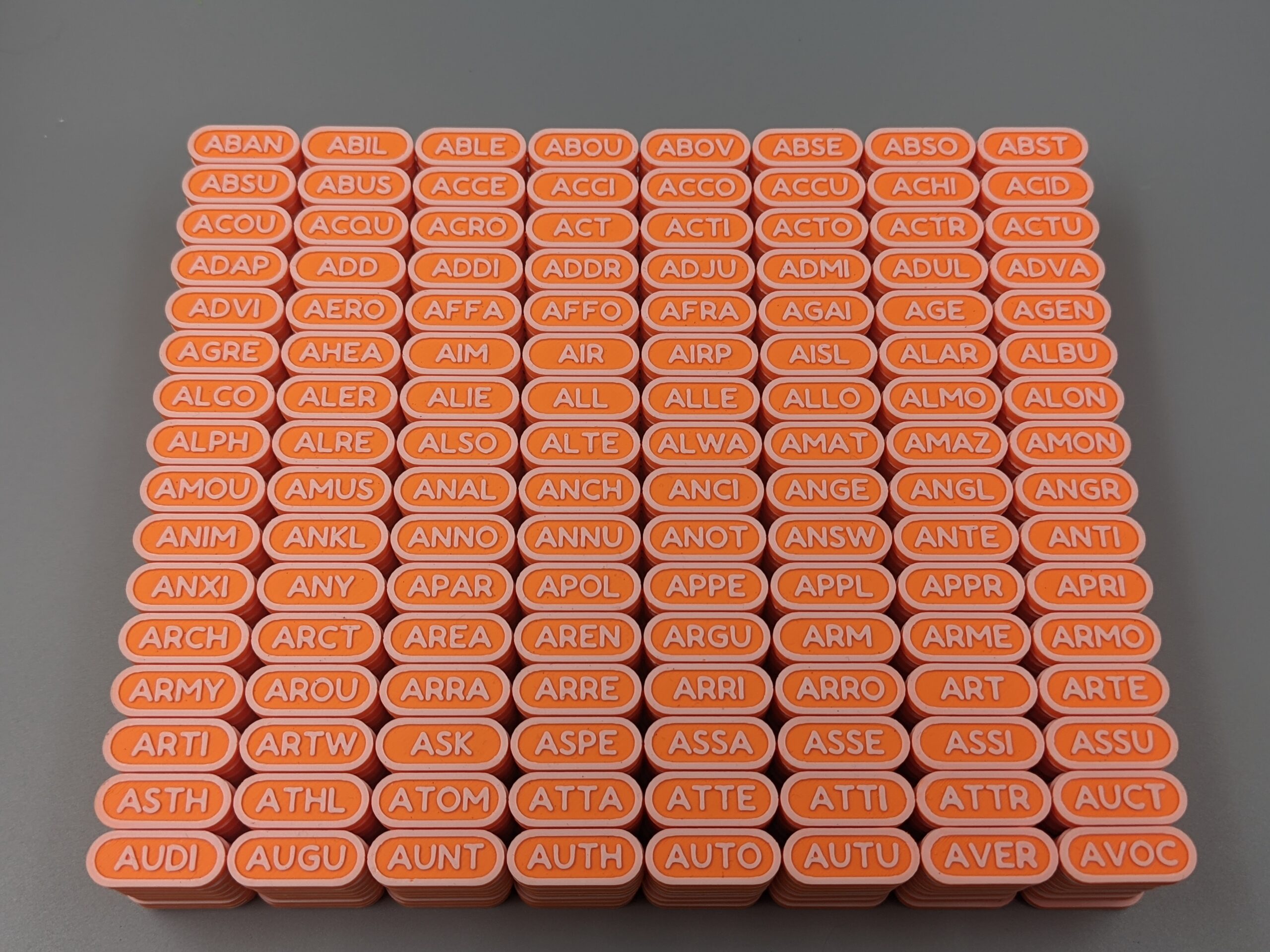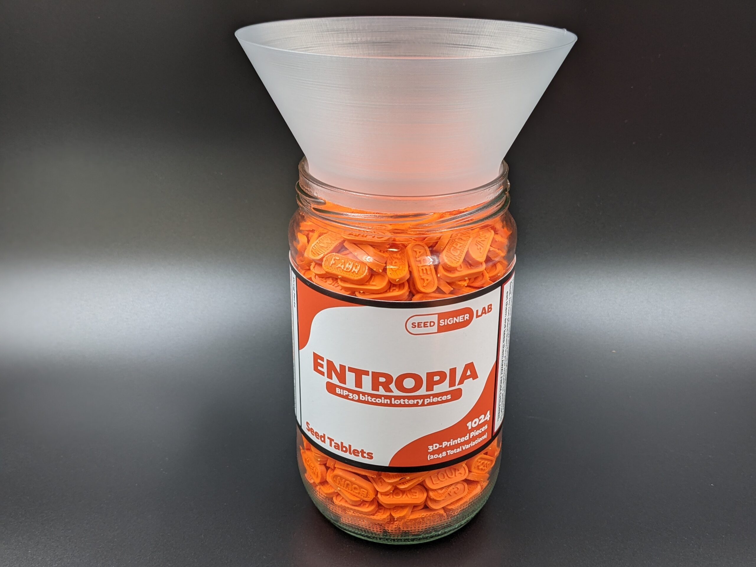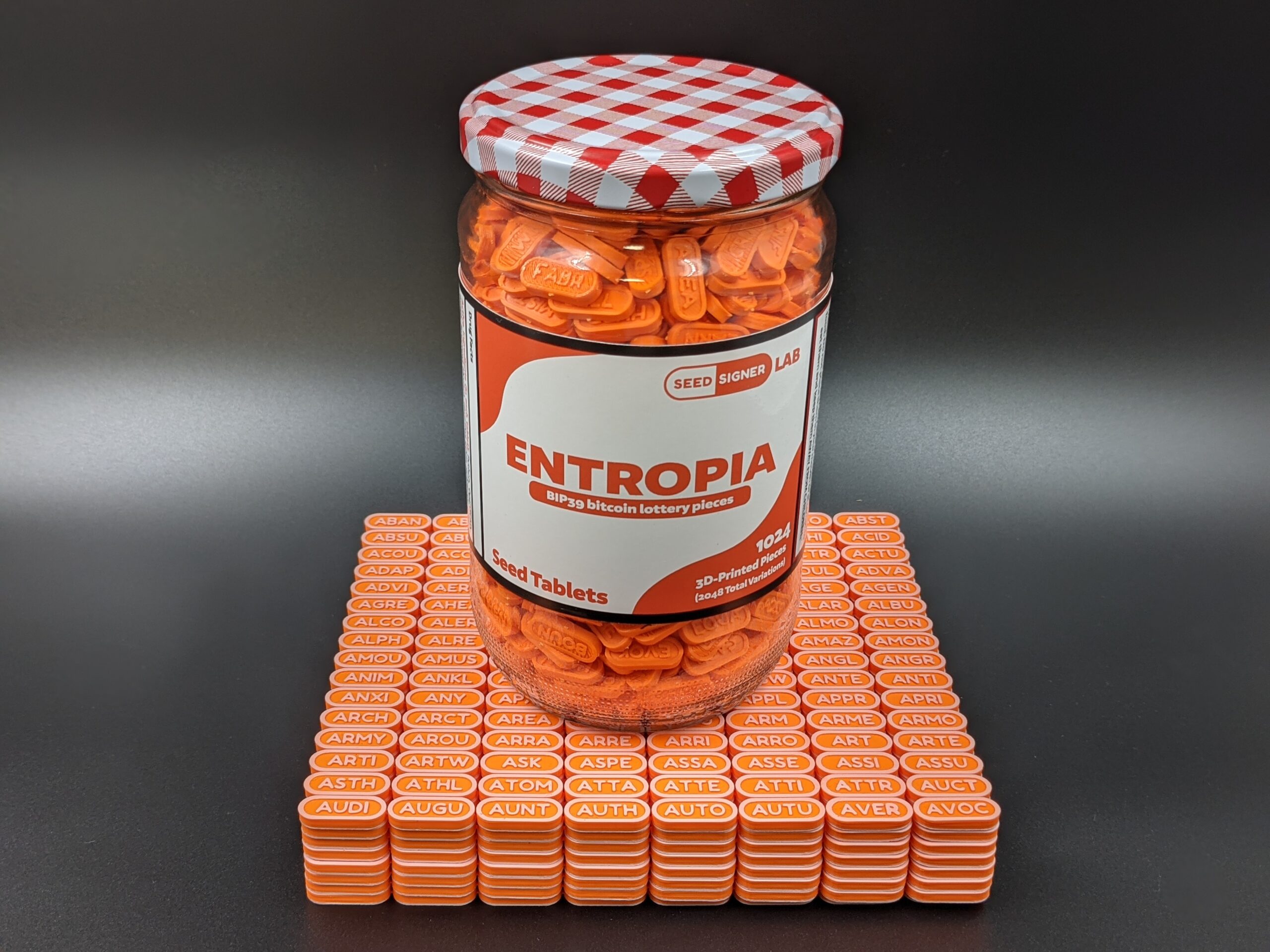 The set includes the pictured display jar with label, eight 8×16 sheets of seed tablets (for a total of 1,024 pieces), and a custom funnel. Two unique strings of 3-4 letters are placed on each tablet (one on either side) to create a total of 2,048 variations that represent the 2,048 unique words in the official bitcoin BIP39 word list. The sheets of tablets are alphabetized and can be verified against the official BIP39 word list available at: