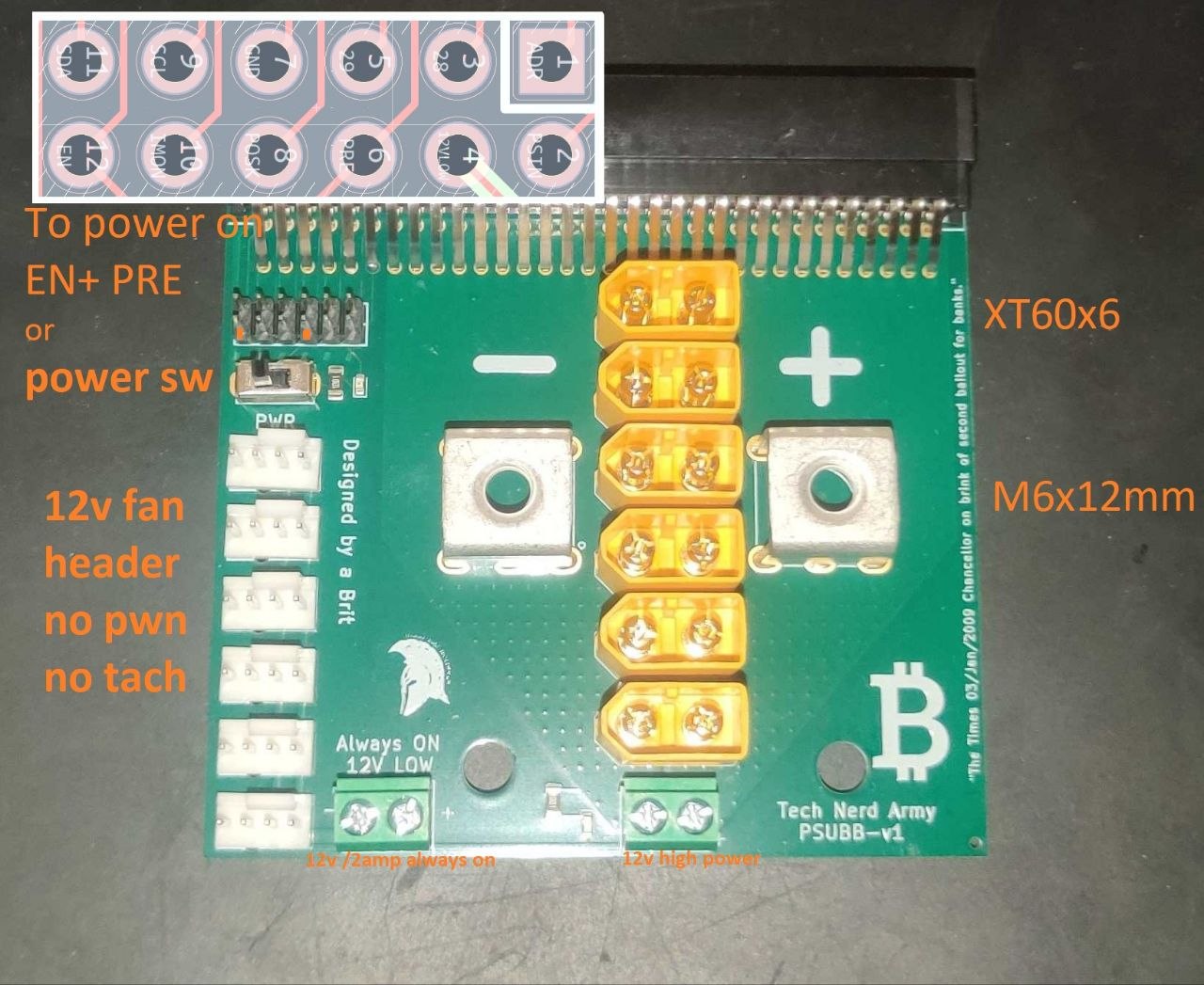 Turn a compatible server power supply into a clean, organized 12V power distribution hub for Bitcoin miners and bench setups. PSUBB gives you 6 XT60 outputs, 6 always-on fan headers, a low-power always-on 12V output, and a switched accessory terminal. All from a single server PSU.