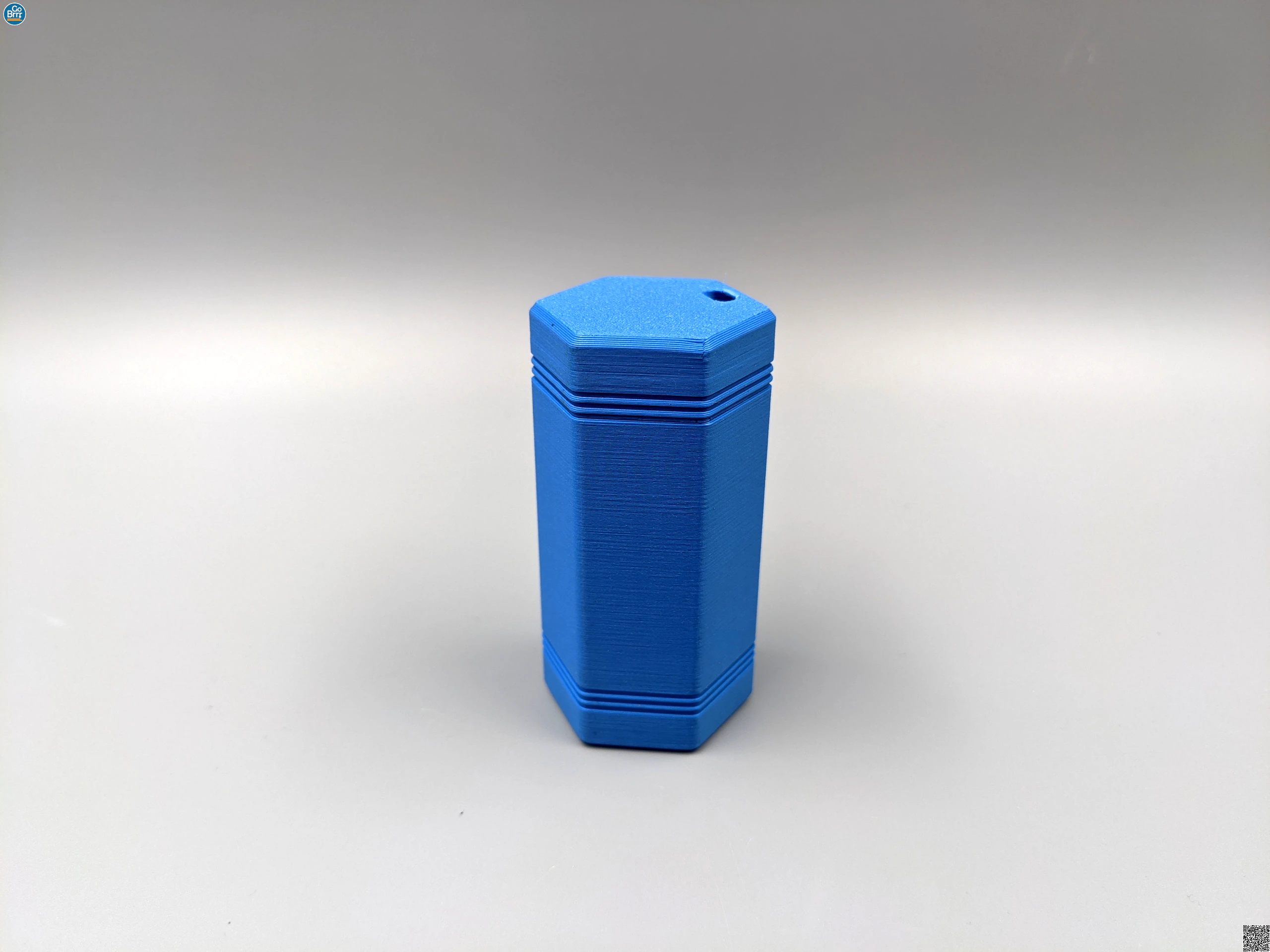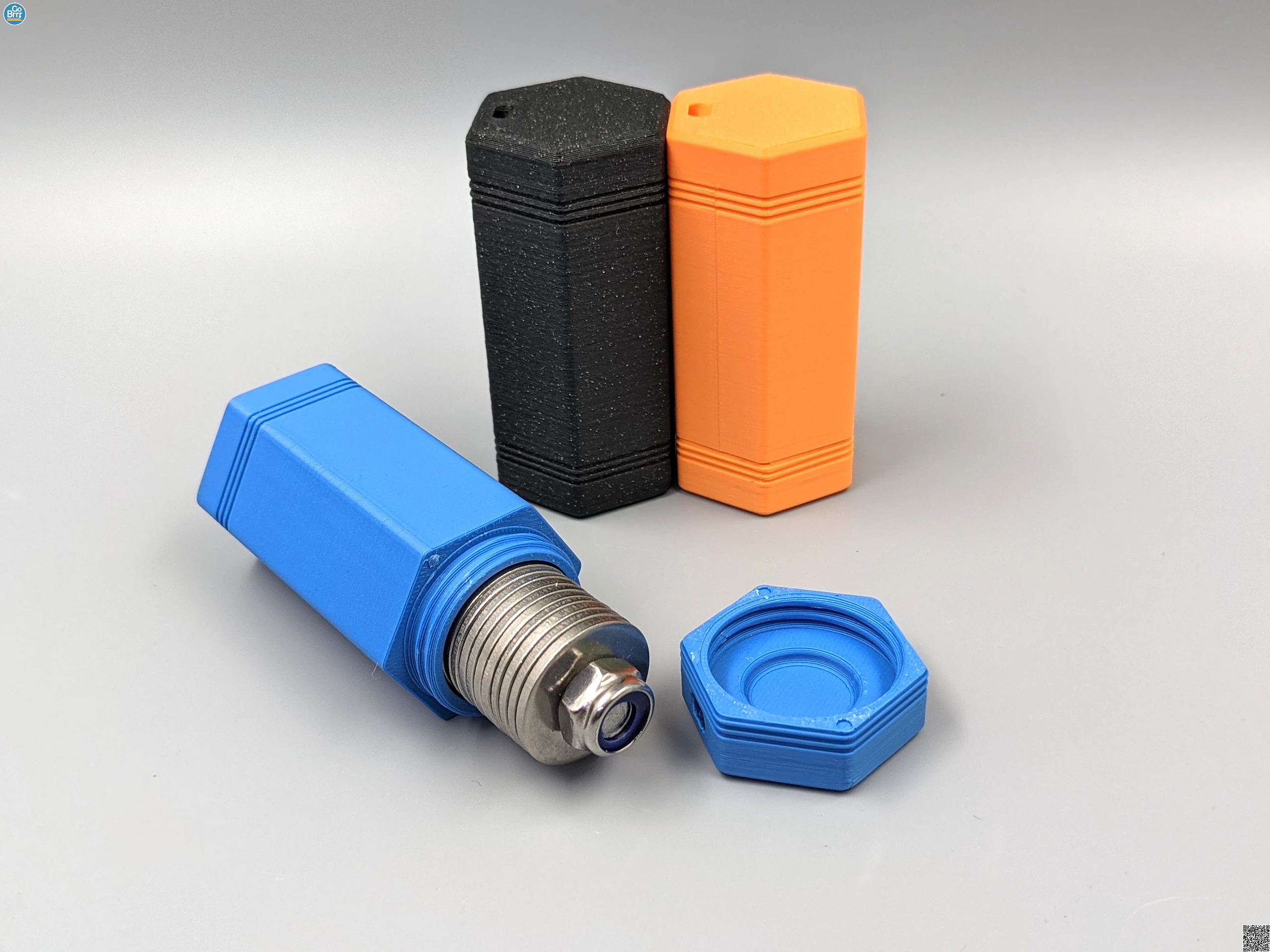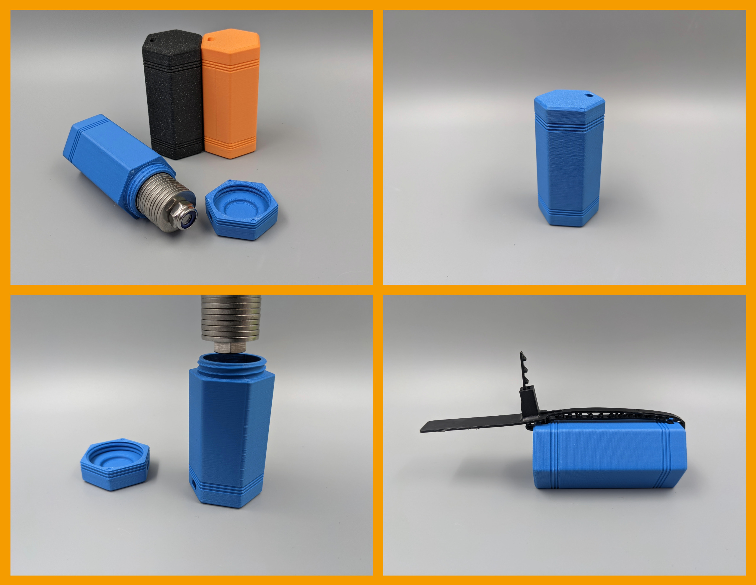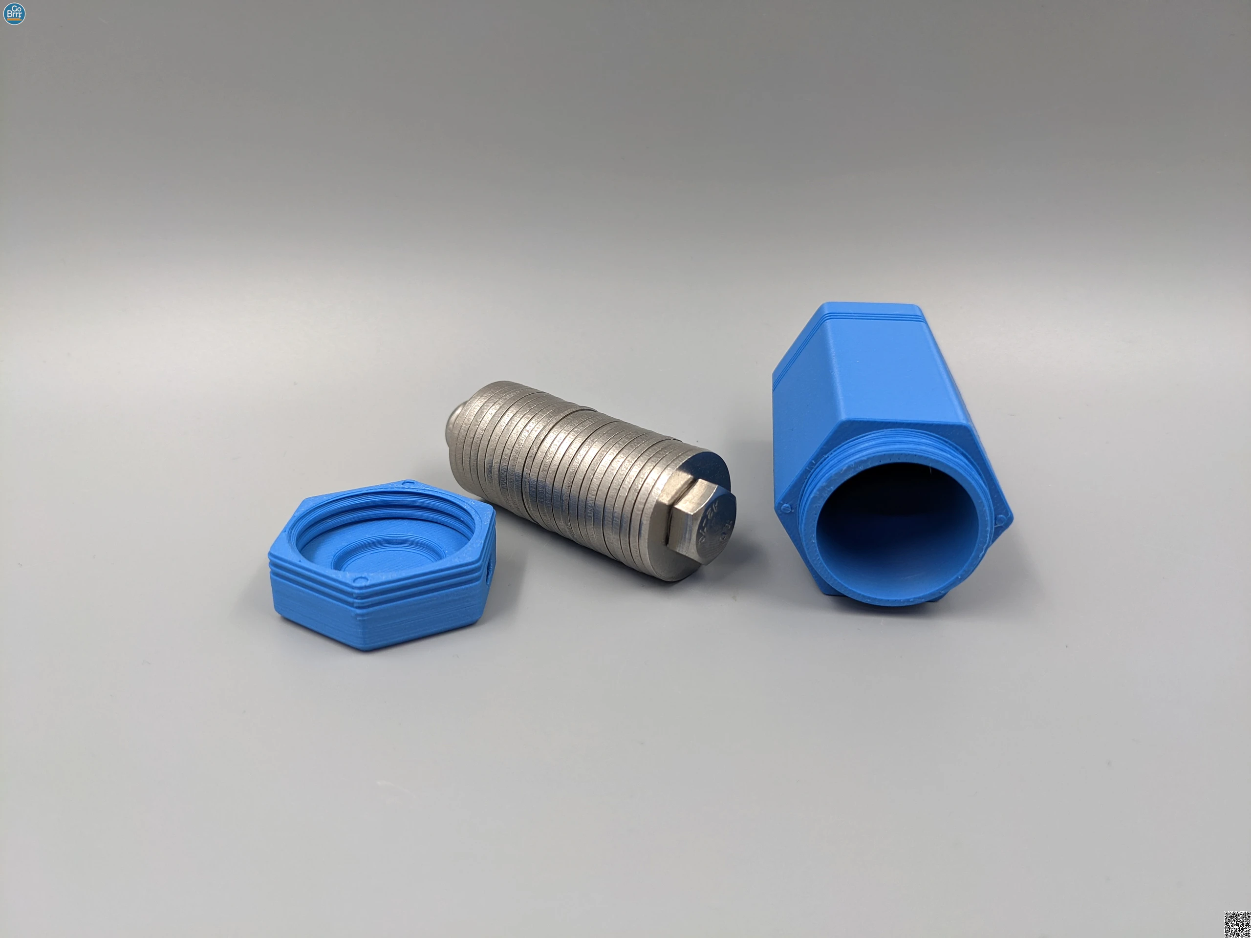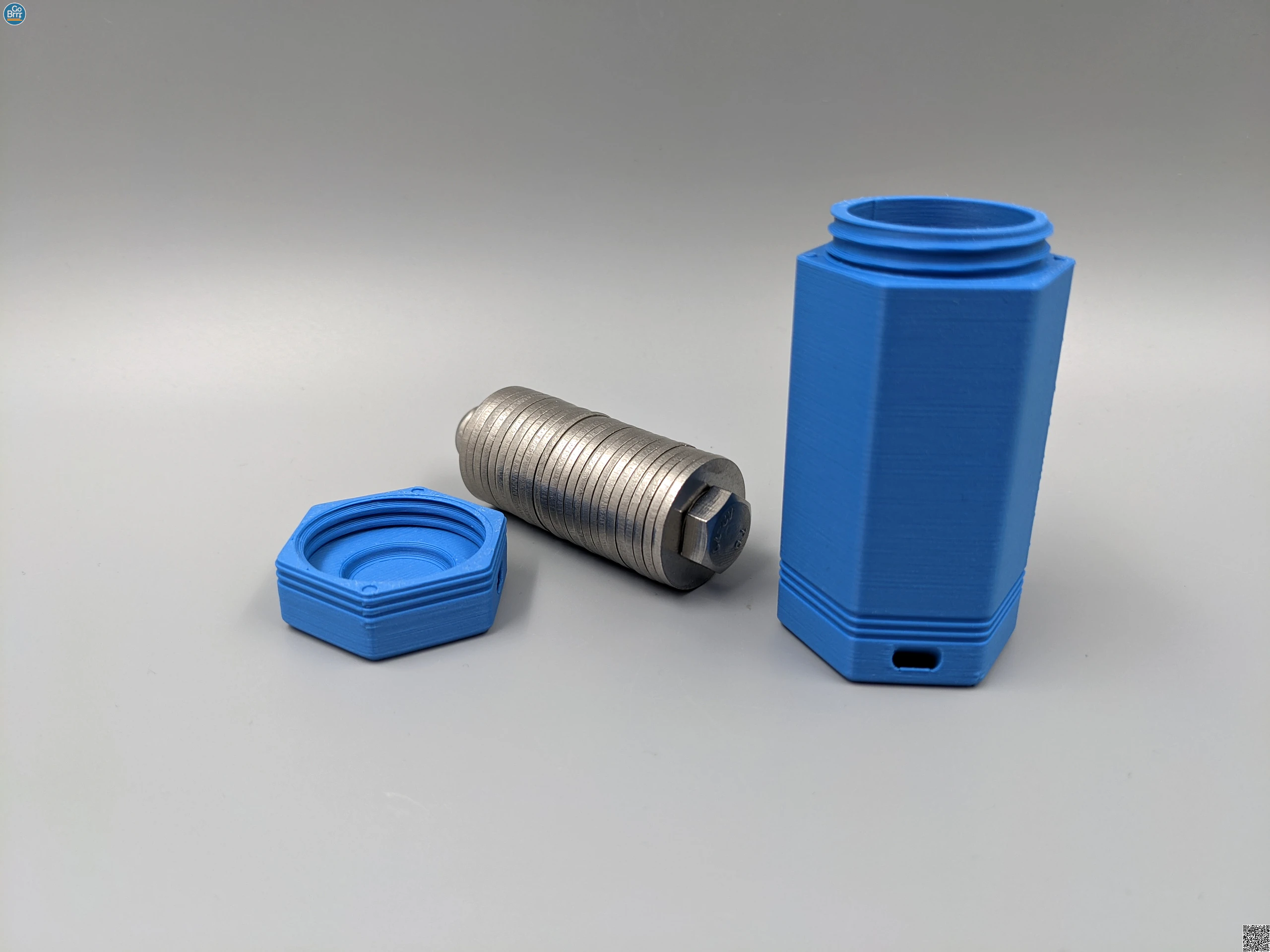 A hexagon shaped, screwable Stackbox for a Blockmit style Seed phrase backup using M8 stainless steel washers (24 mm outer diameter). The container screws shut safely and can be locked with a tamper-evident seal (included) through the two slits on the top and bottom. To open it, the pictured seal, the container itself, or both must be damaged or destroyed, which will be evidently visible.