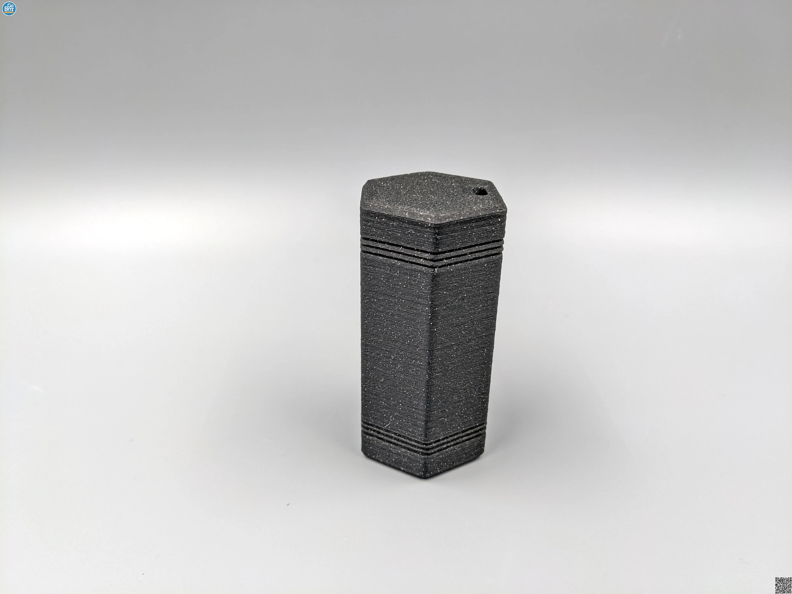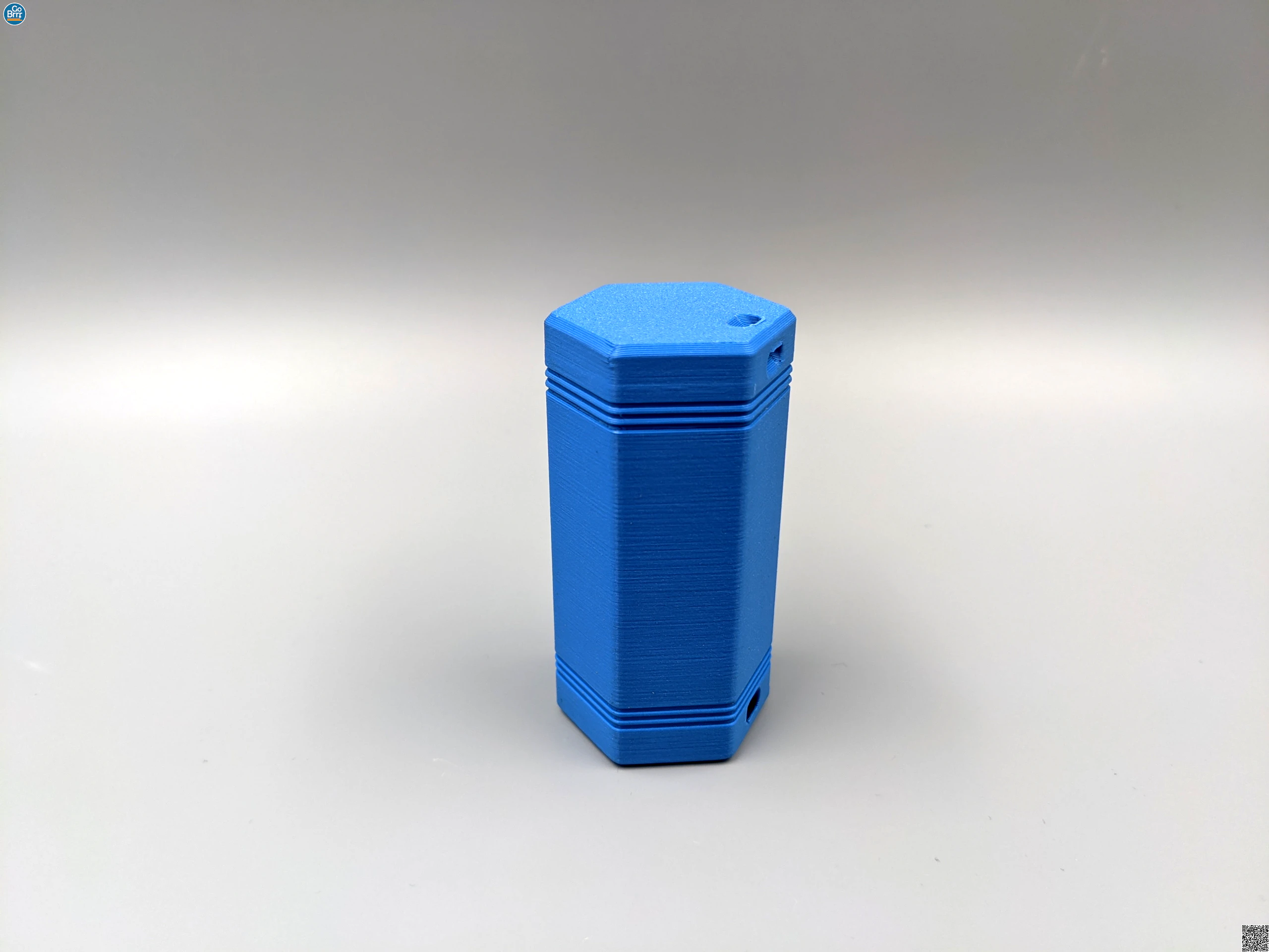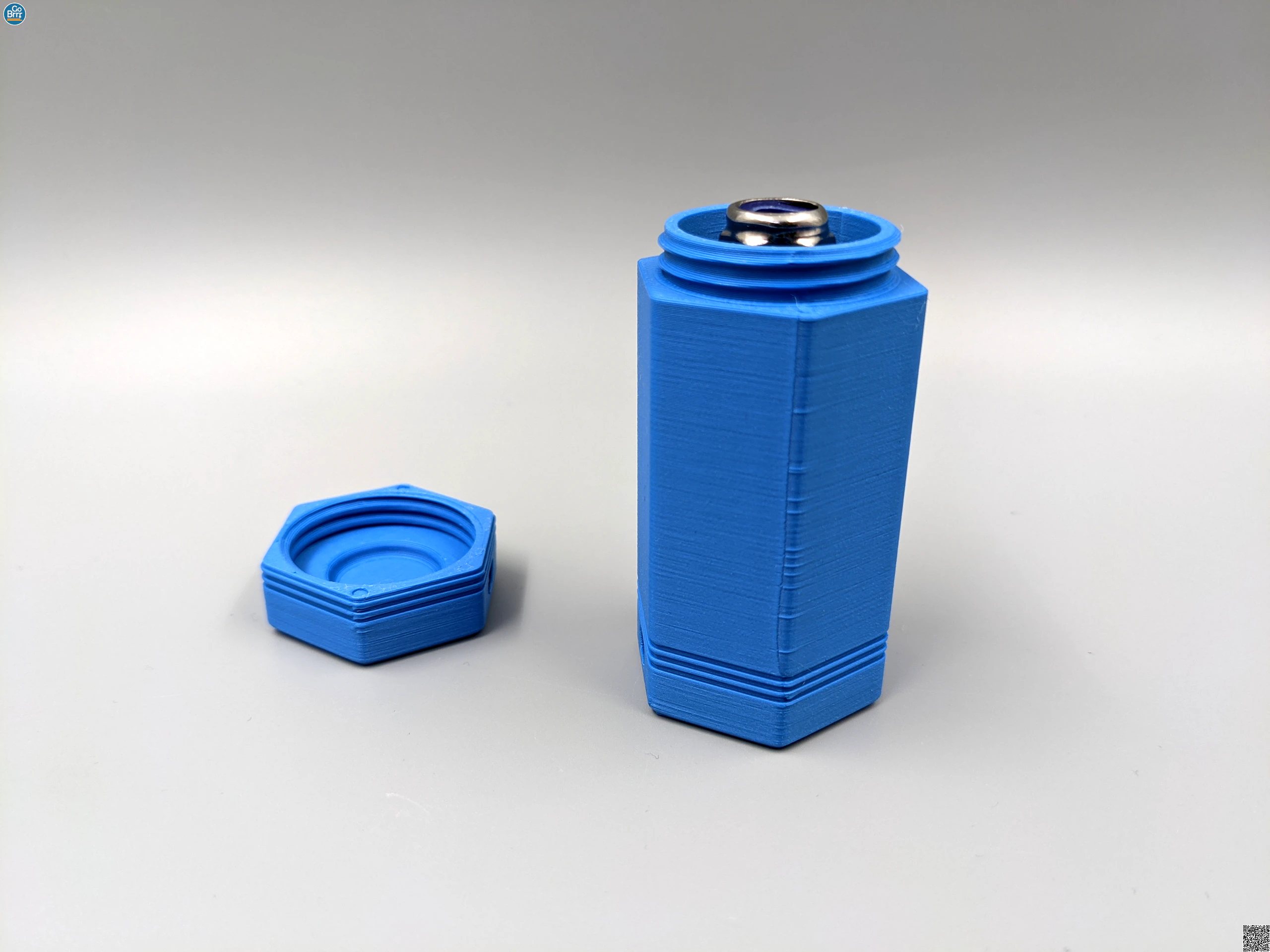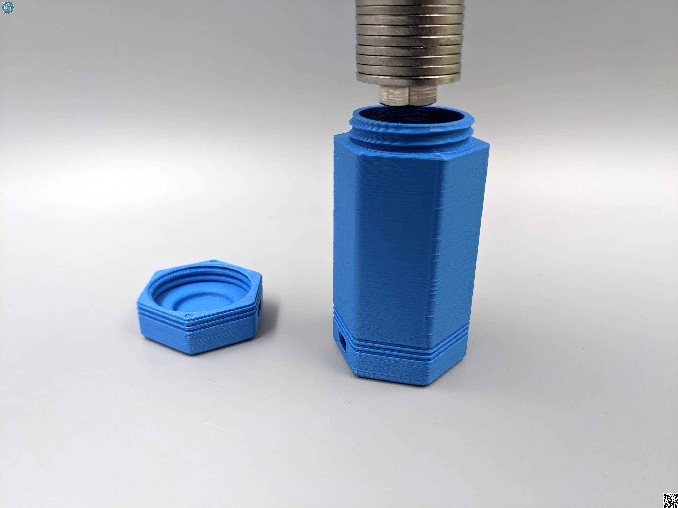 A hexagon shaped, screwable Stackbox for a Blockmit style Seed phrase backup using M8 stainless steel washers (24 mm outer diameter). The container screws shut safely and can be locked with a tamper-evident seal (included) through the two slits on the top and bottom. To open it, the pictured seal, the container itself, or both must be damaged or destroyed, which will be evidently visible.