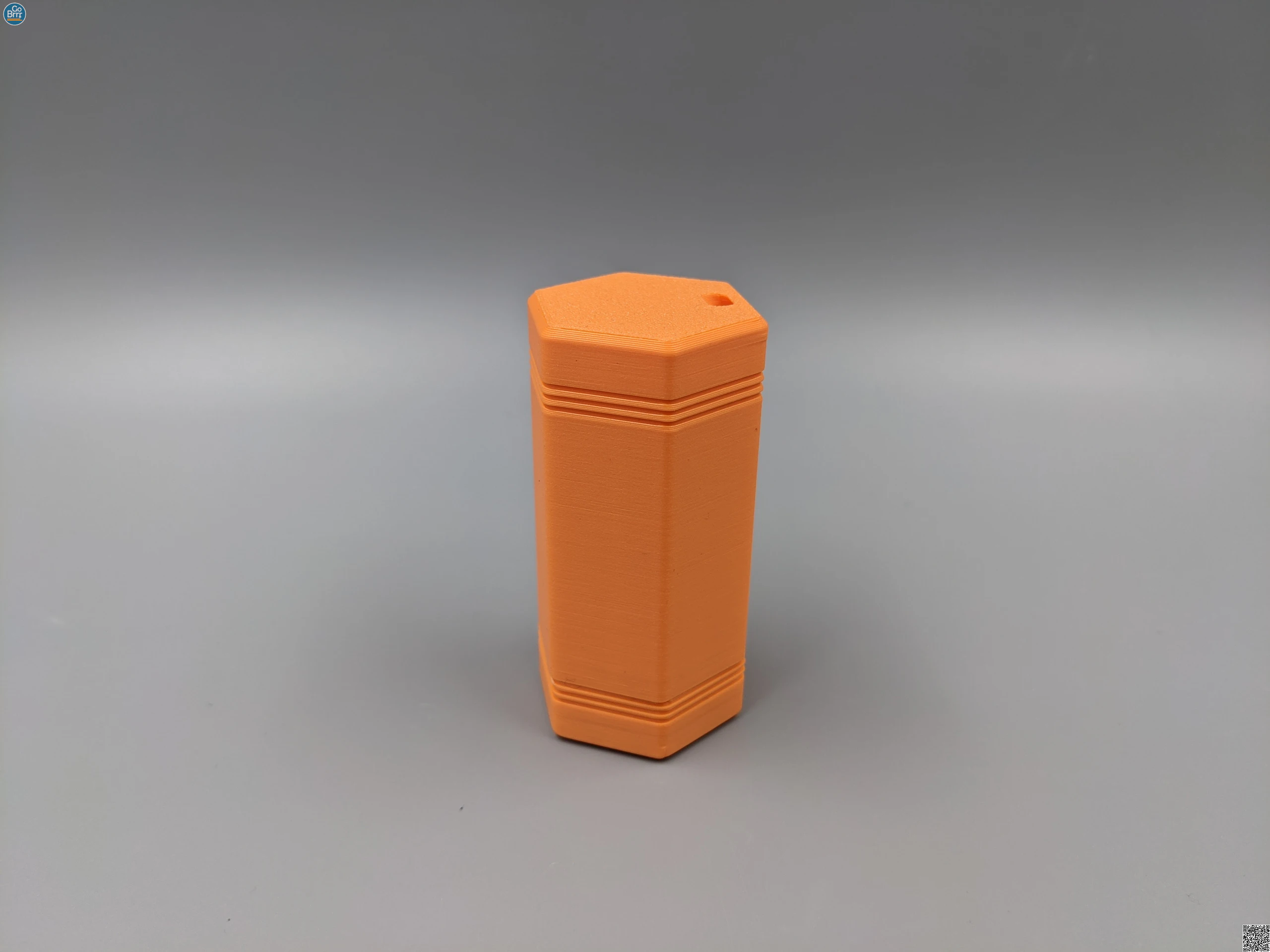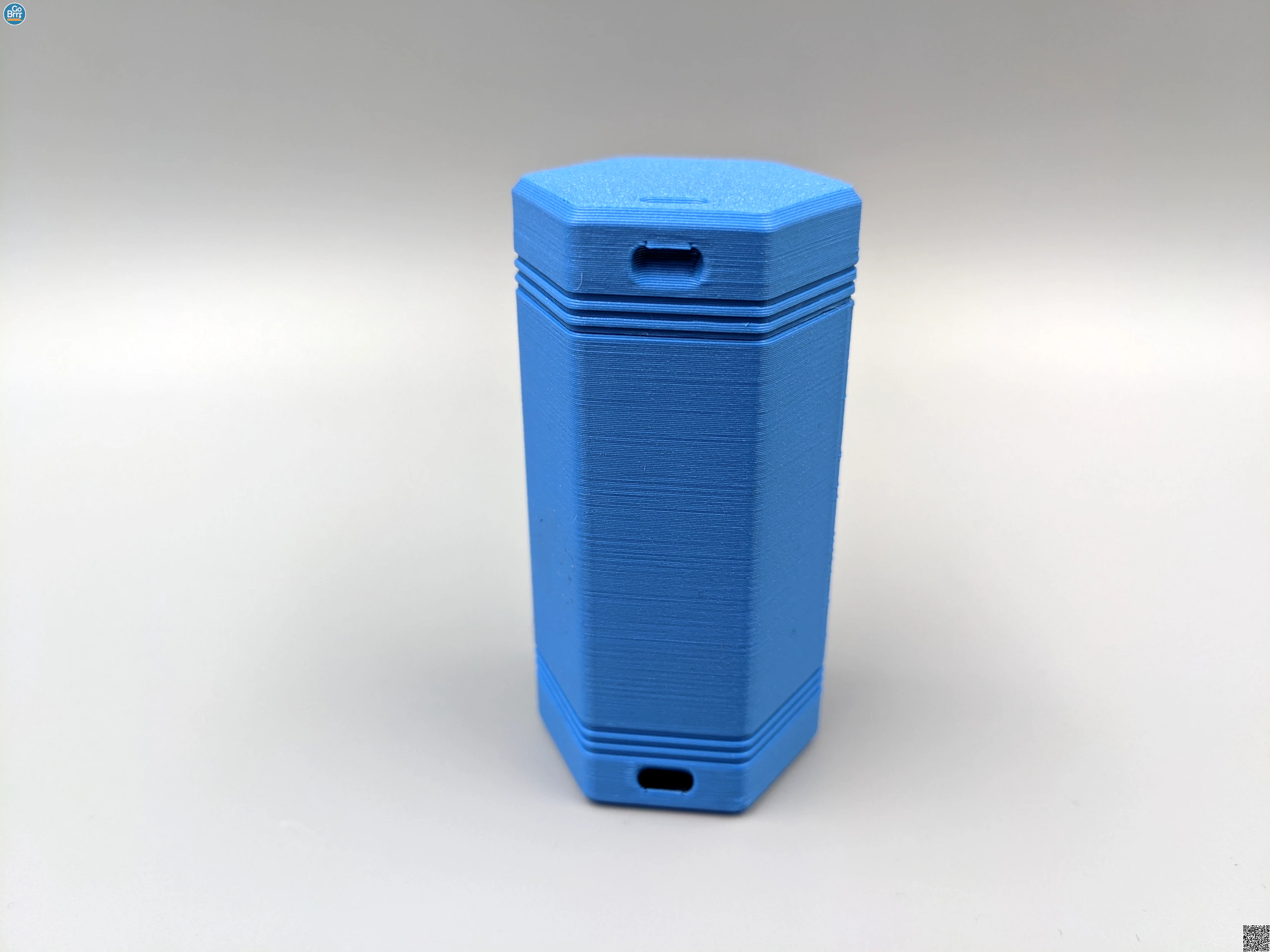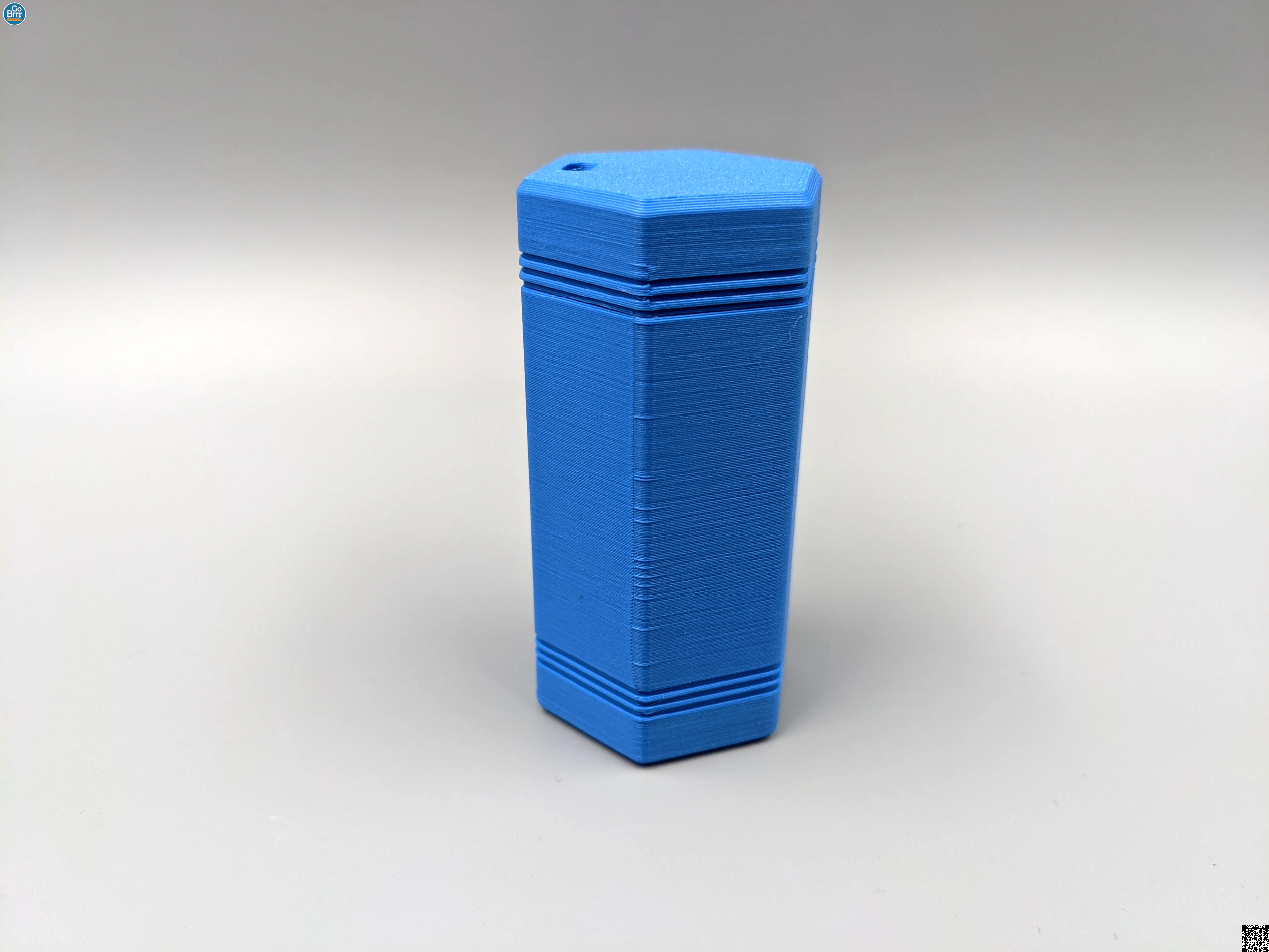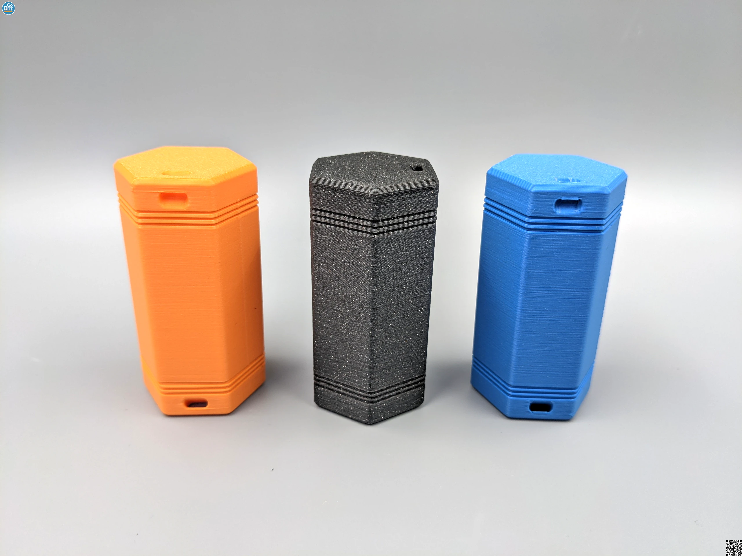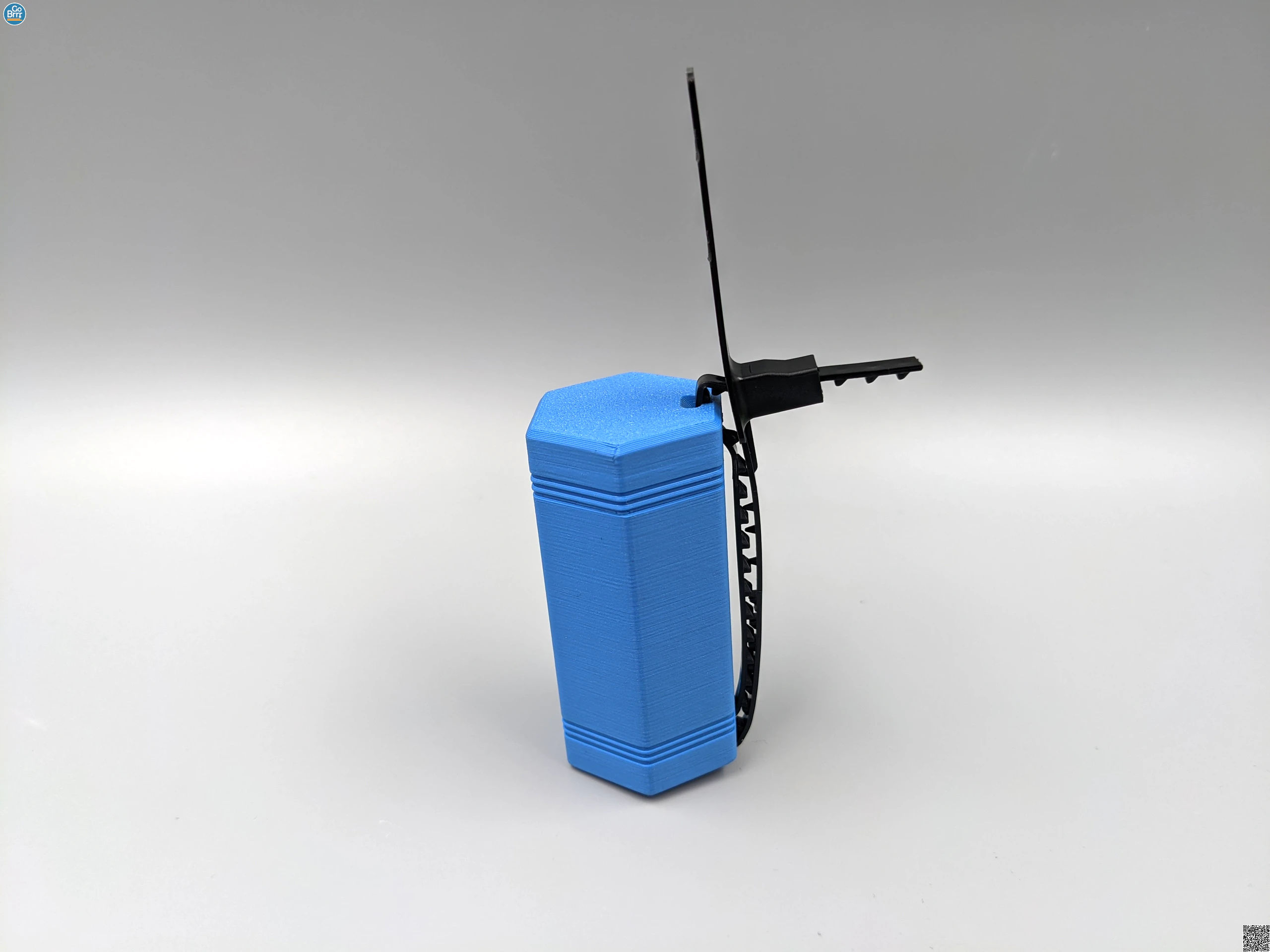 A hexagon shaped, screwable Stackbox for a Blockmit style Seed phrase backup using M8 stainless steel washers (24 mm outer diameter). The container screws shut safely and can be locked with a tamper-evident seal (included) through the two slits on the top and bottom. To open it, the pictured seal, the container itself, or both must be damaged or destroyed, which will be evidently visible.