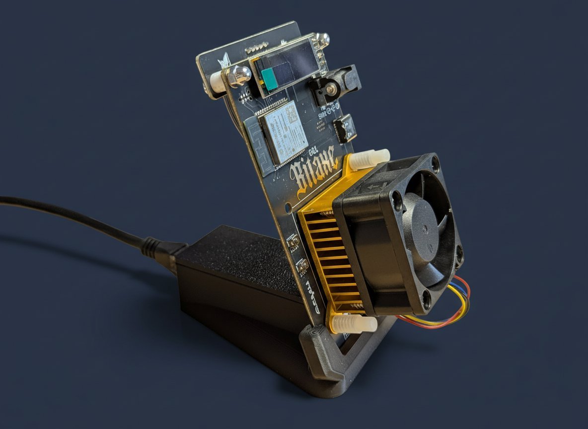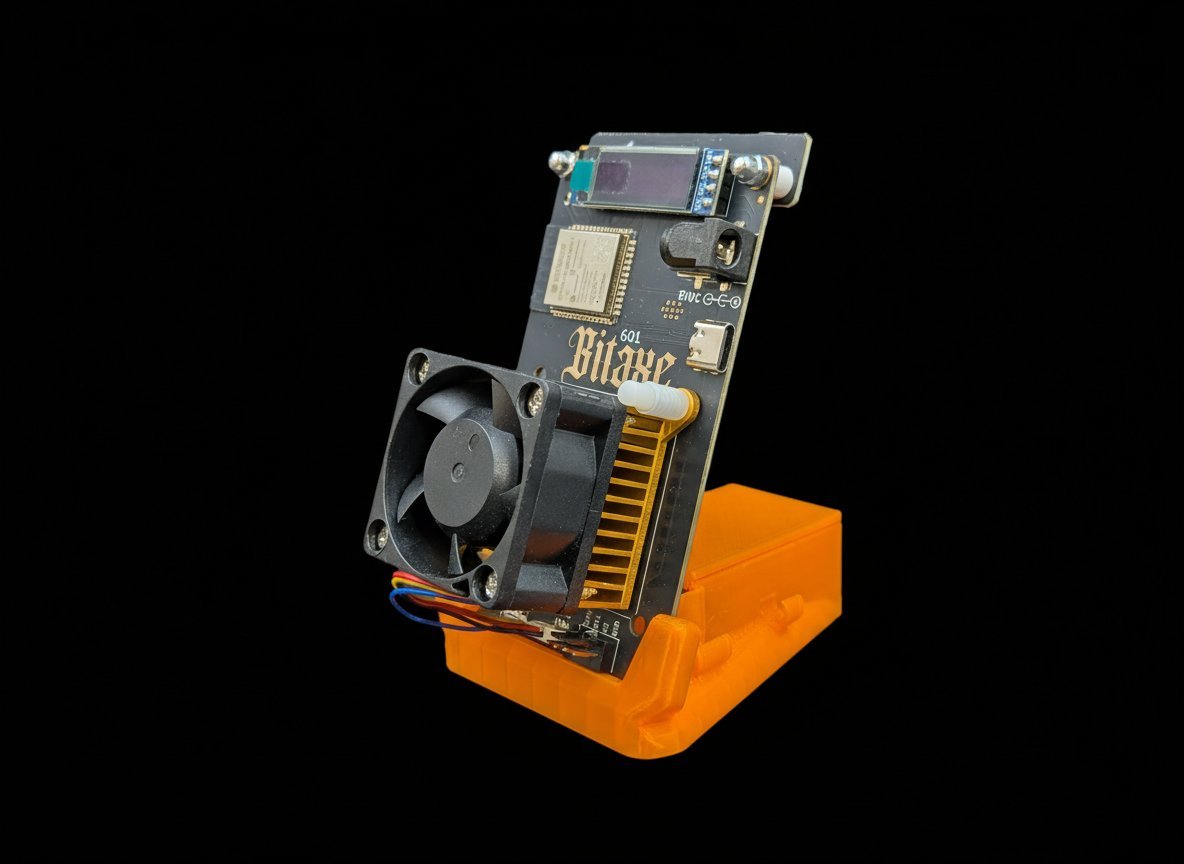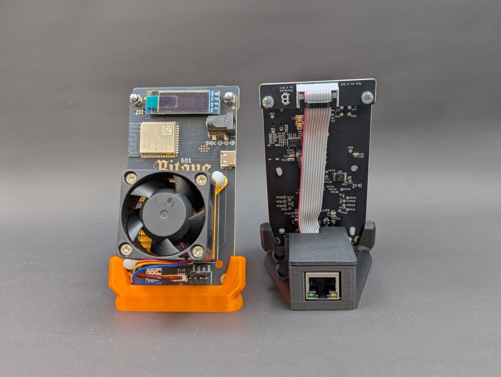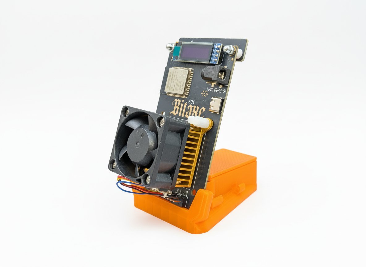 Bitaxe Gamma 601, fitted in the Bitaxe LAN stand, coming with the preinstalled LAN adapter and Bitaxe LAN Firmware preflashed.
