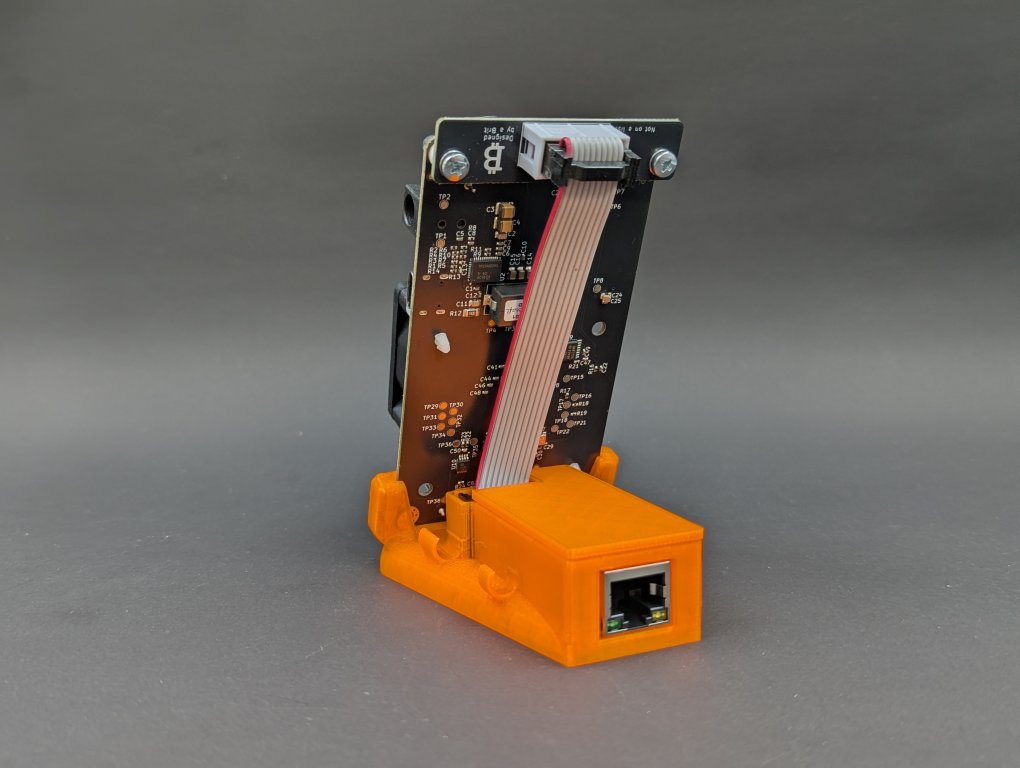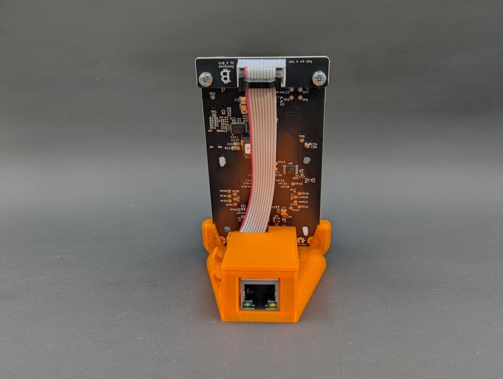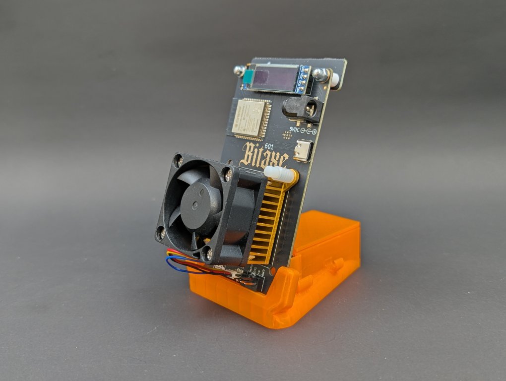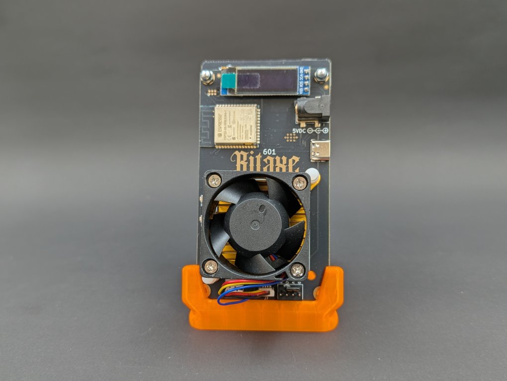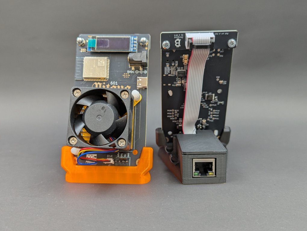 Bitaxe Gamma 601, fitted in the Bitaxe LAN stand, coming with the preinstalled LAN adapter and Bitaxe LAN Firmware preflashed.