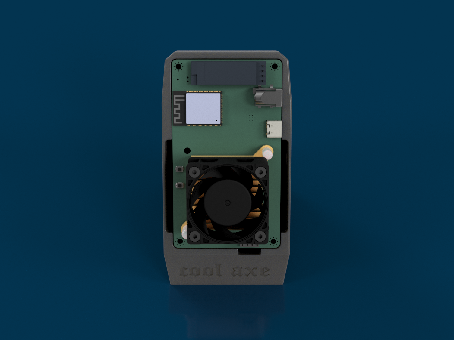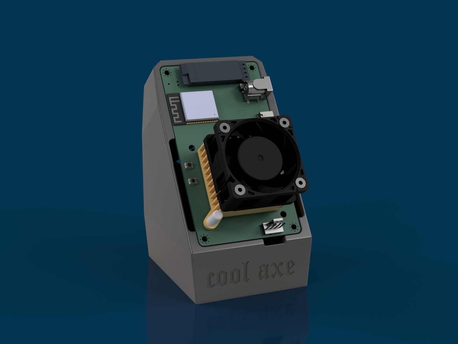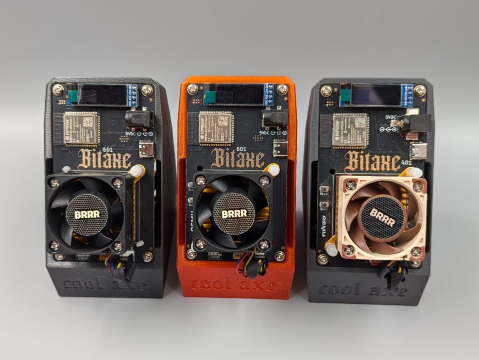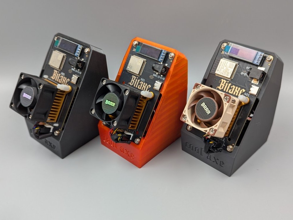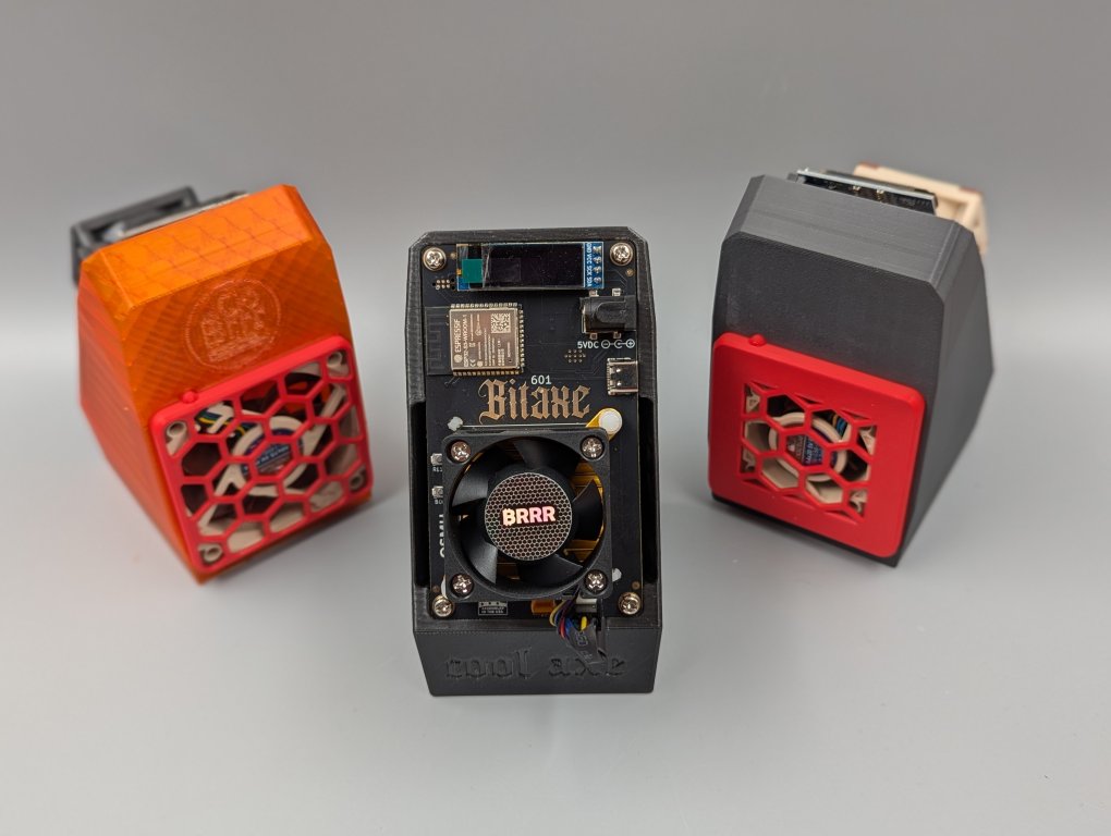 Specifically designed to fit all Bitaxe models, including the powerful Bitaxe Gamma, this stand not only enhances your mining setup aesthetically but significantly boosts performance through an innovative cooling system. Negative pressure sucks the hot air from the ASIC through the stand itself, created by a fan in the back of the stand which vents the air out. This approach allows your Bitaxe to maintain a significantly lower operating temperature, even with stock heatsink and fan. Compatible with two rear fan sizes, 60x60x15 mm and 40x40x20 mm, available with or without fan, pick the 60mm fan for the best performance. Full access to the back of the Bitaxe makes the CoolAxe the perfect base for modding. Test results show the Bitaxe Gamma in the CoolAxe Stand (60mm fan) maintains a median temperature around ~46.5°C with stock cooling and settings and a median temperature of 59°C when running highly overclocked. This can be further reduced with aftermarket heatsinks and fans, allowing you to push the Bitaxe to its limits. In our testing, a heatsink on the back of the voltage regulator proved to be a effective addition to this setup and is highly recommended. The CoolAxe is printed from PETG to avoid material degradation and ensure long term stability when overclocking, so the color options are limited. 4Pin Y Splitter Cable included.