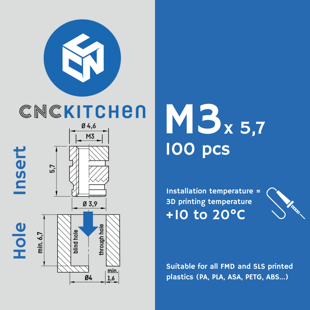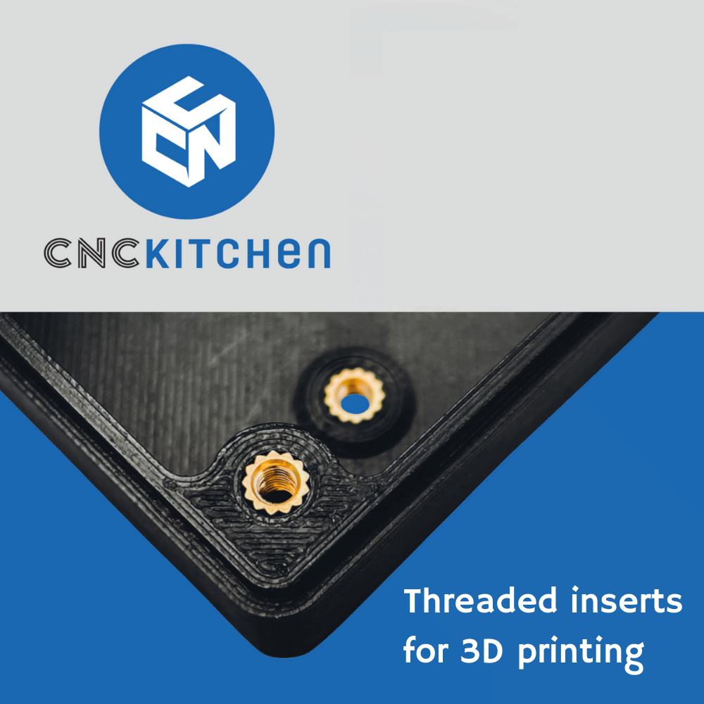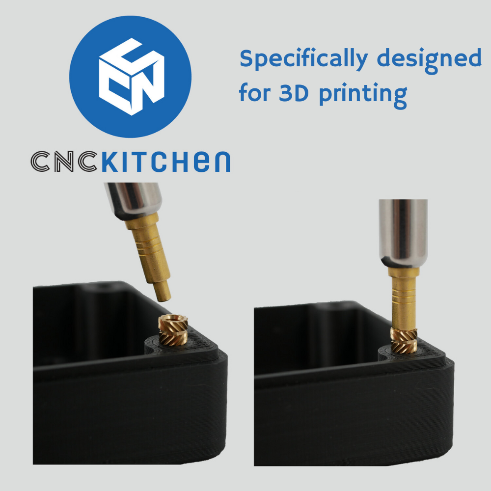 Threaded inserts not only look great in 3D printed parts, but they also have a practical use. Everyone has had a device that was assembled with screws. After disassembling and reassembling it a few times, you realize that if the screws dug directly into the plastic, they won’t hold anymore. Each time you screw the parts together, the material gets deformed at the threads, which eventually leaves you with nothing but a ragged hole where nothing can grab. This is where thread inserts come into play. By melting them into your parts, they are positively bonded to the plastic and no longer move. The screws are now turned into durable and also low-friction brass, and thus will last forever.