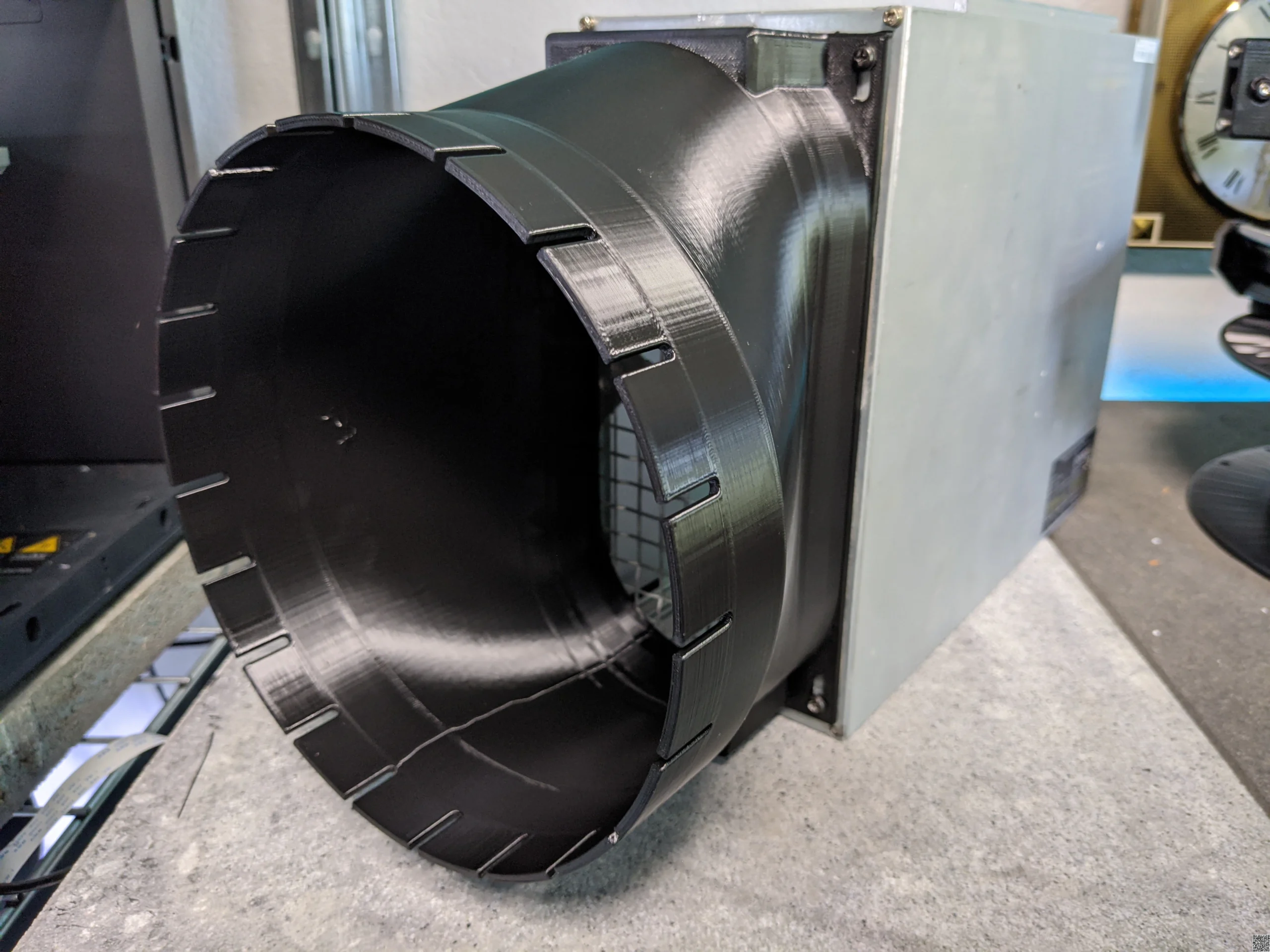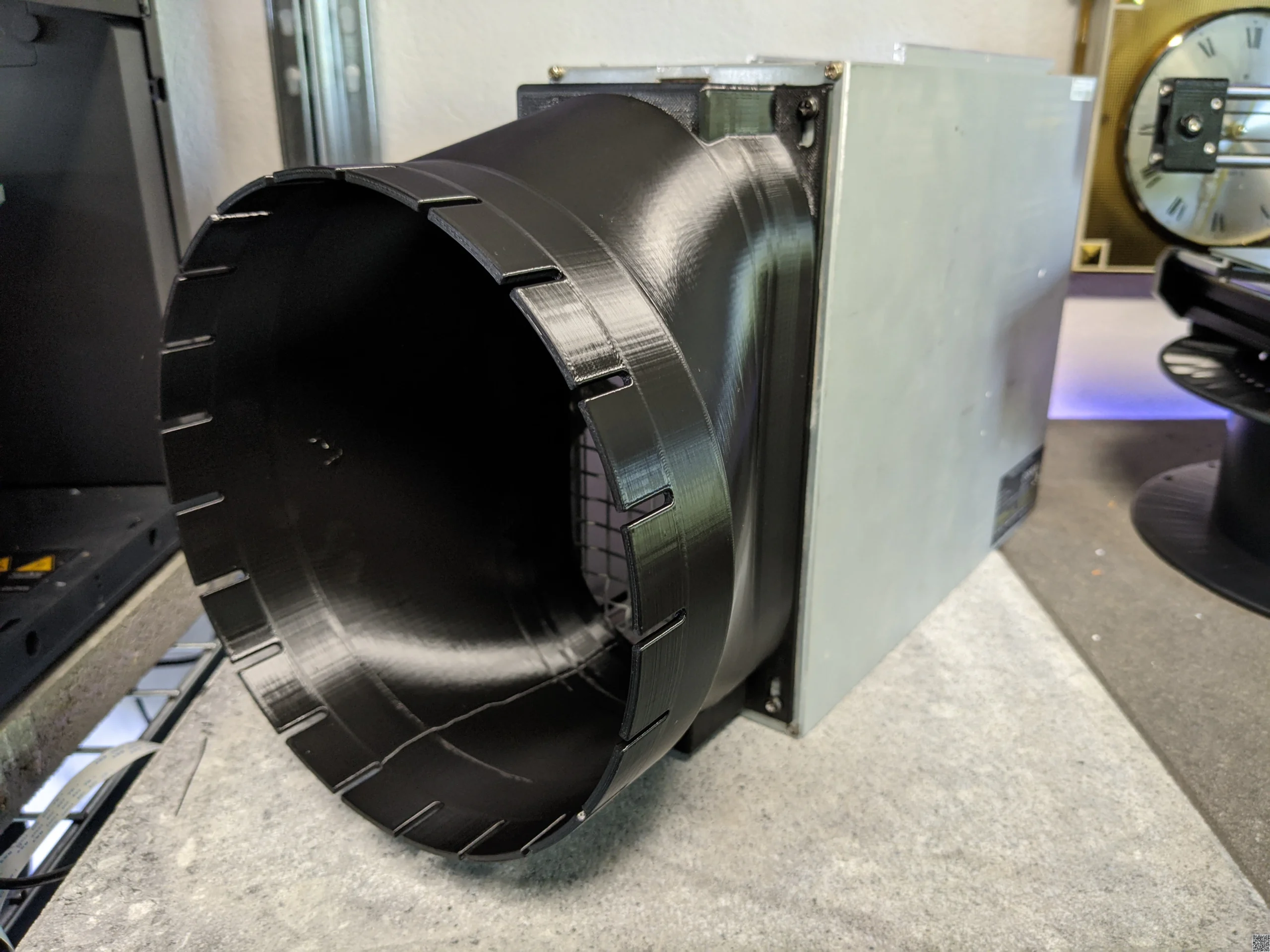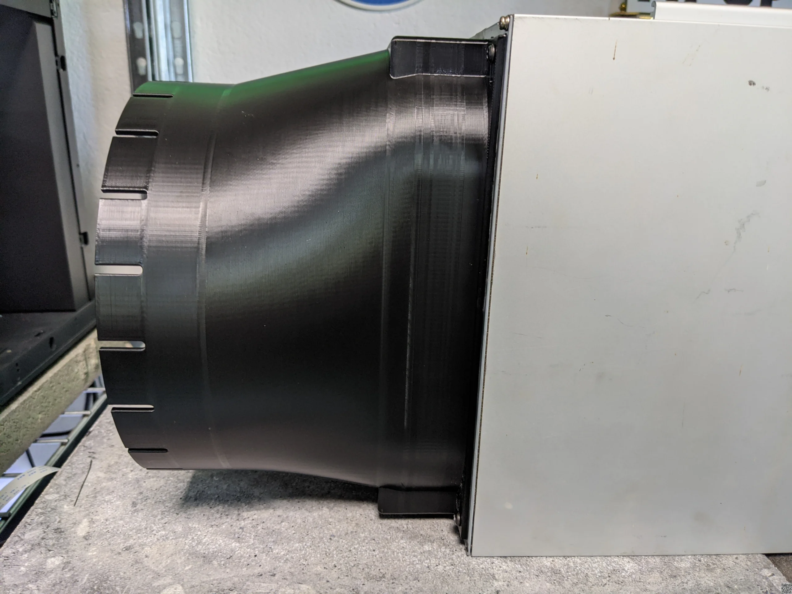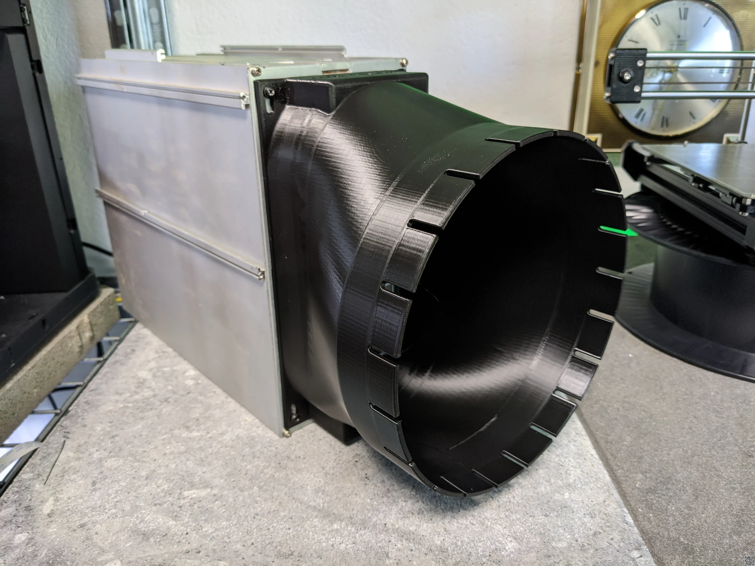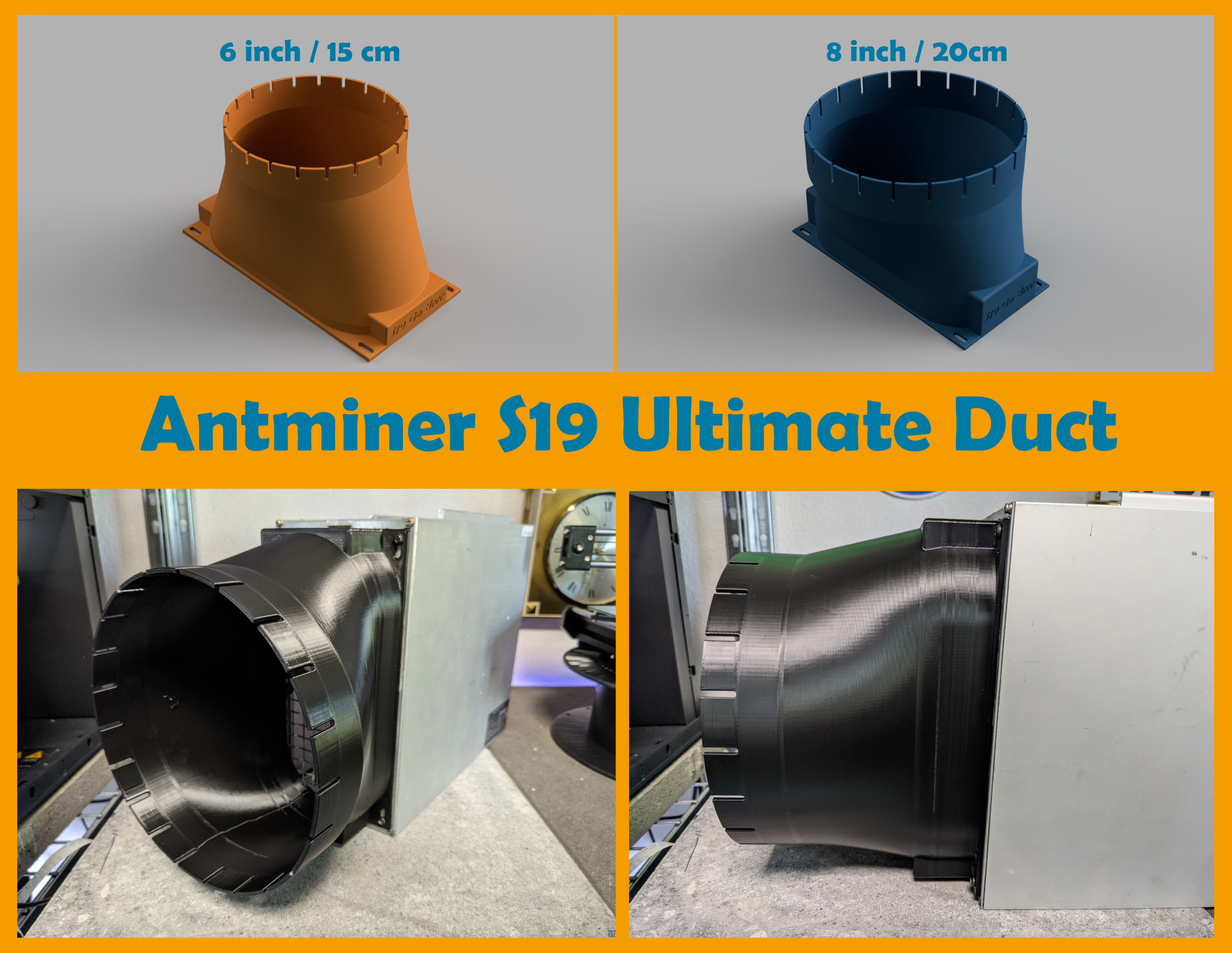 A beefy fan duct shroud for Bitmain Antminer S19 (and variations of it) available with a 20cm (8inch) and 15cm (6inch) slotted outlet for easy af ducting.  The airtunnel is offset just enough, so the duct can be used in just about every possible miner orientation. Additionally, it features a small stand reducing strain on the miner.  Printed from PETG, temperature resistant up to 90°C.