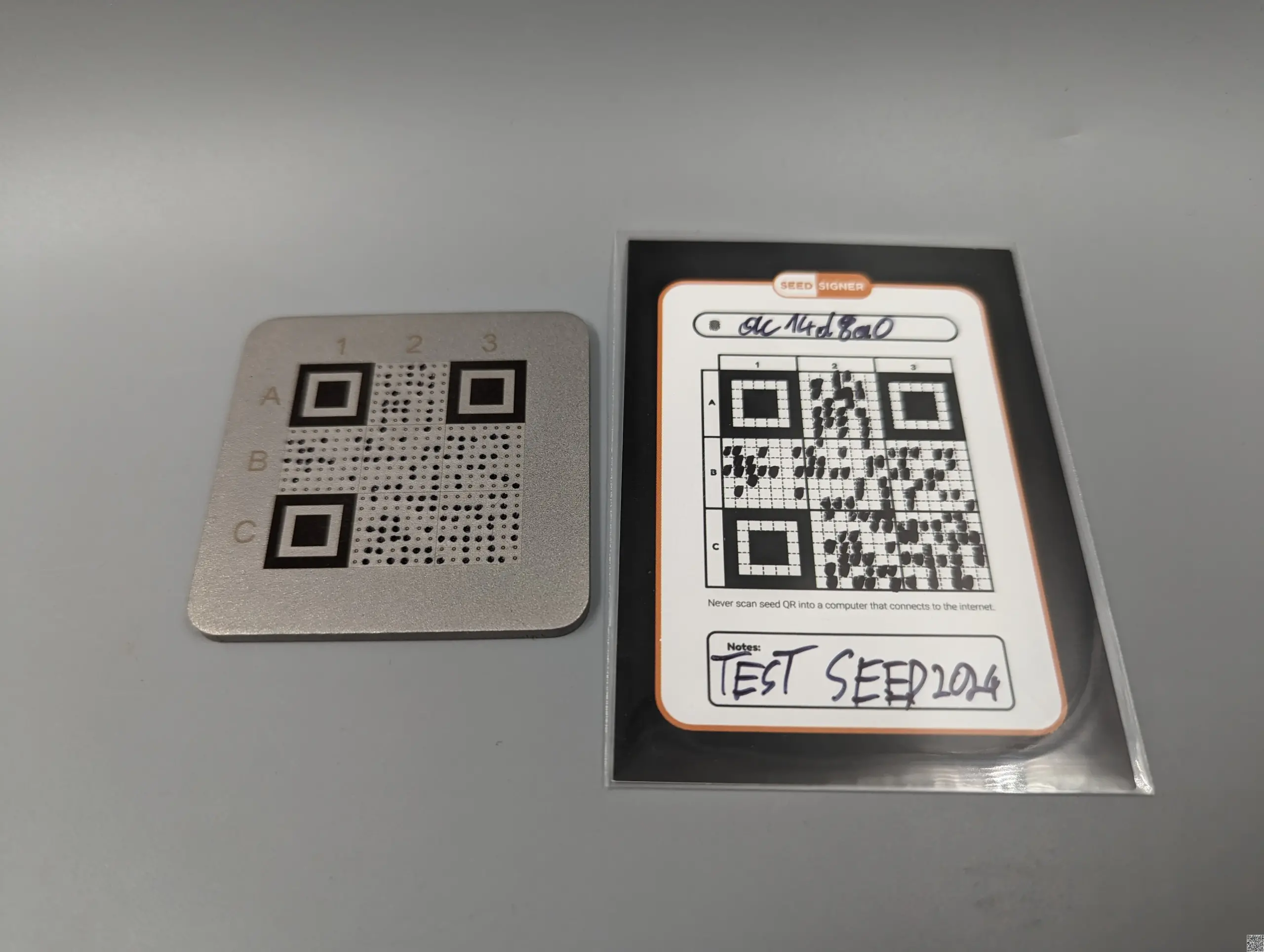 • 21×21 grid. Secures a 12 word seed as a compact SeedQR (compatible with SeedSigner / Blockstream Jade / Foundation Passport)